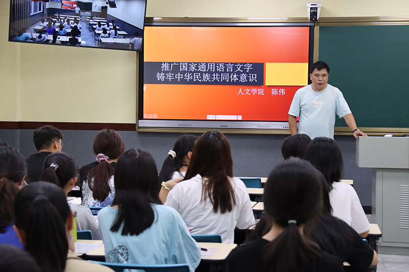 举办“推广国家通用语言文字,铸牢中华民族共同体意识”讲座。9月13日,云南省语言学会常务理事、人文学院副院长陈伟教授面向全校师生作题为“推广国家通用语言文字,铸牢中华民族共同体意识”讲座。讲座围绕宪法和法律对国家语言文字使用的规定,积极宣传国家语言文字各项方针政策及规范标准,重点介绍《中华人民共和国国家通用语言文字法》和《云南省国家通用语言文字条例》,明确国家通用语言文字是法定的全国各民族通用的语言文字,弘扬爱国主义精神,充分激发师生对国家通用语言文字的认同感、自豪感和自觉规范使用意识。