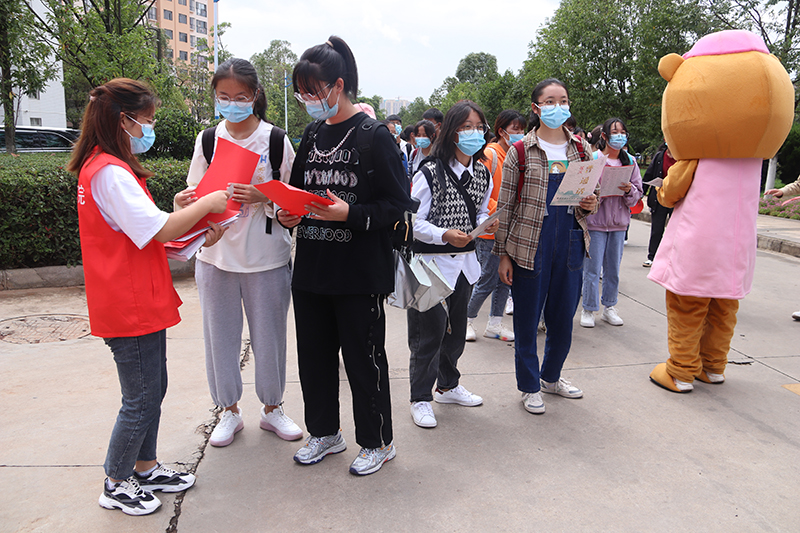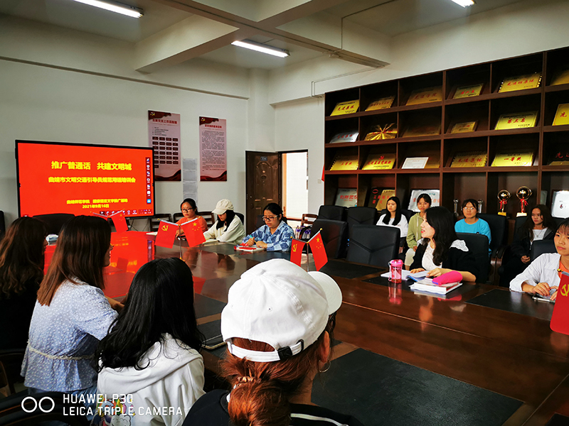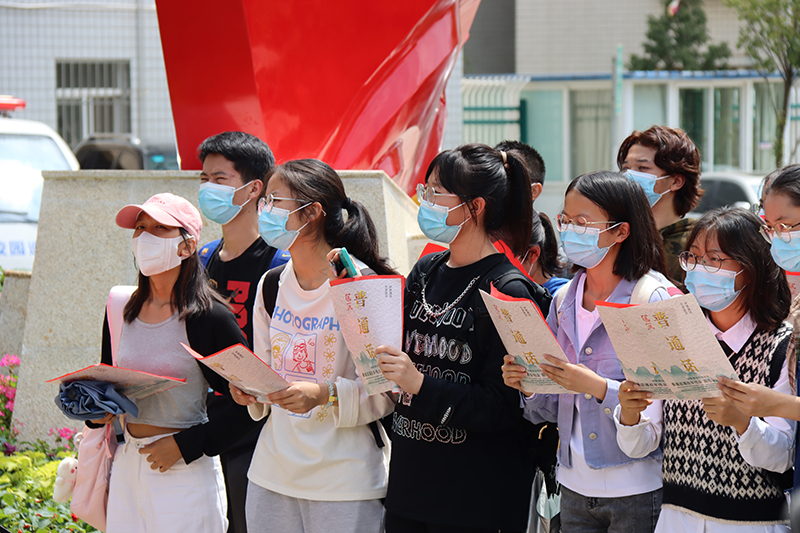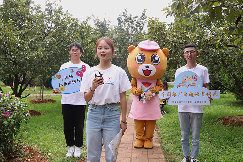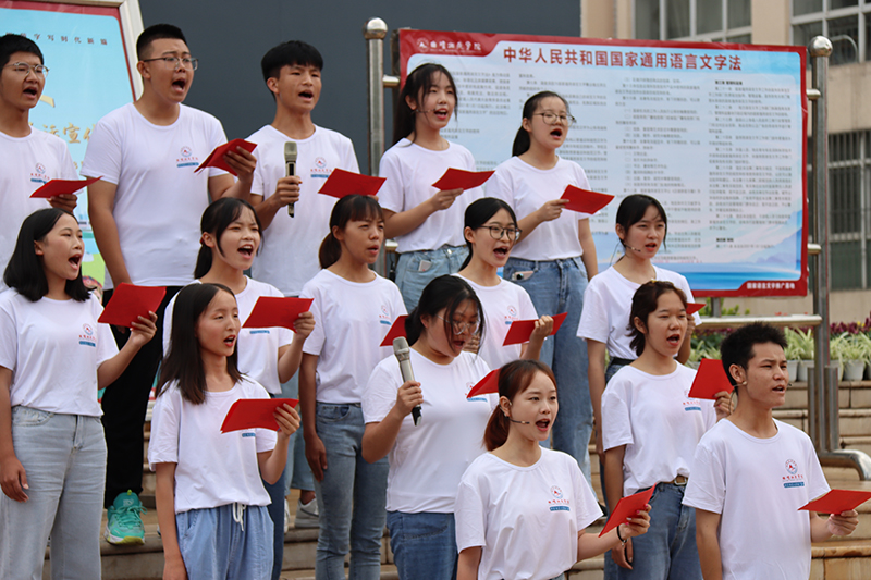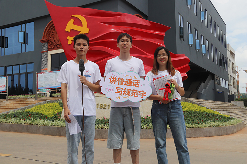 开展“普通话诵百年伟业,规范字写时代新篇”红色经典诗词诵读快闪活动。9月15日,师生们在曲靖红色文化展览馆前共同诵读《我有祖国,我有母语》和《中国话》两首经典诗歌,歌颂百年伟业,渲染推普气氛,扩大推普宣传影响。通过校园随机采访、绕口令游戏和发放推普宣传册等活动,吸引师生积极参与推普,感受语言文字的魅力,进一步明确了推普宣传周的主题及意义。