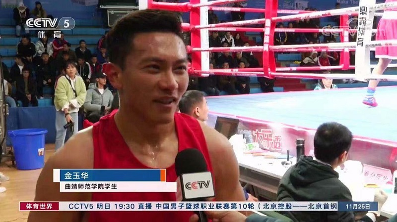 金玉华参加全国大学生拳击比赛时接受CCTV5的采访。