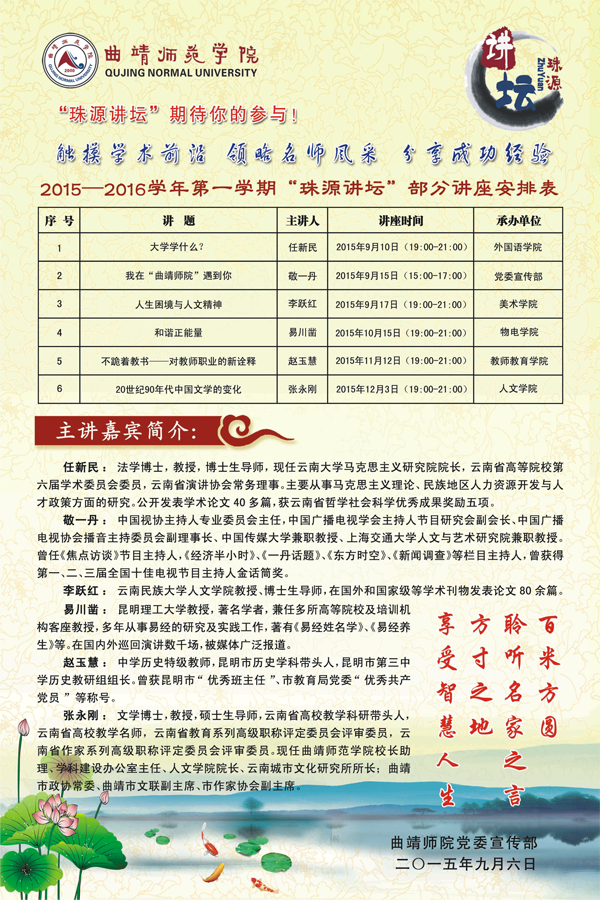 2015—2016学年第一学期“珠源讲坛”部分讲座安排