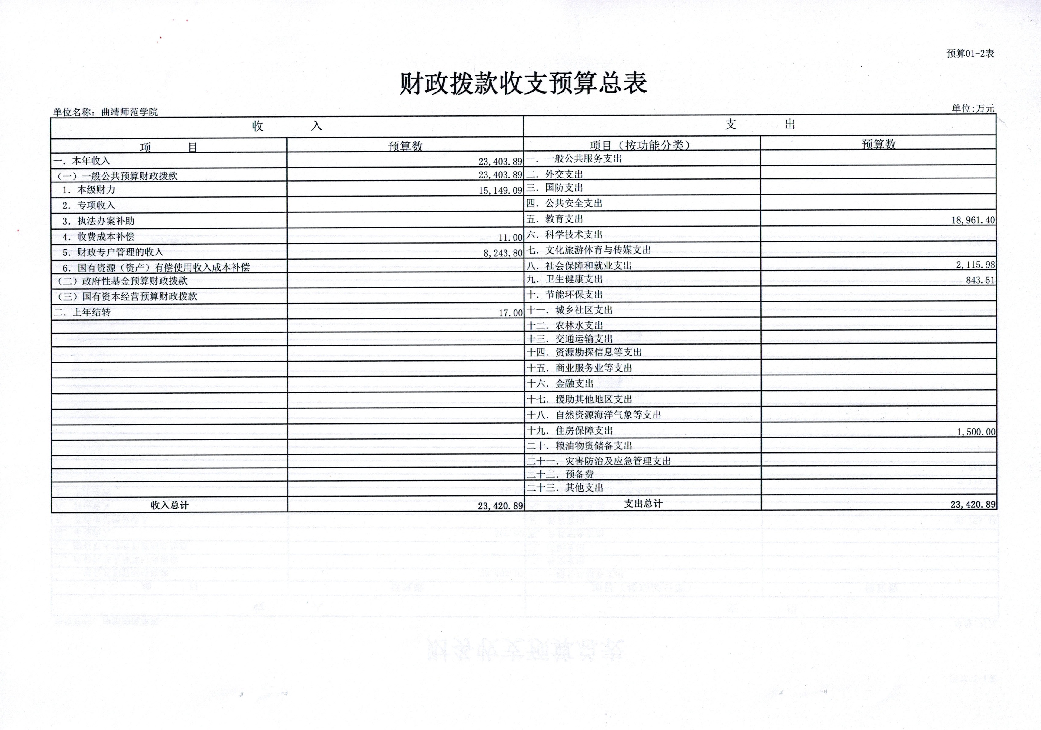 2019年财政拨款收入23,420.89万元,其中:本年收入23,403.89万元,上年结转收入17万元。本年收入中,一般公共预算财政拨款23,403.89万元,其中:本级财力15,149.09万元,收费成本补偿11万元,财政专户管理的收入8,243.8万元,国有资源(资产)有偿使用收费成本补偿0万元),政府性基金财政拨款0万元。