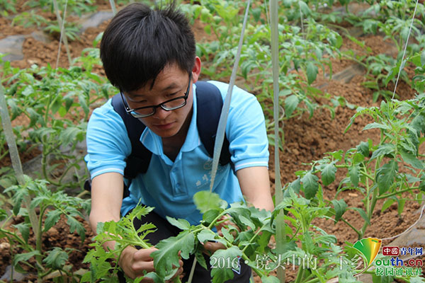 队员实践地梳里瓜藤 。在现代农业示范基地调研的间隙,队员们在工作人员的指导下,参与体验农活,梳理瓜藤也是个技术活,关系到结瓜的数量、质量、速度等多方面,志愿者小王在学习后,小心翼翼的尝试。中国青年网通讯员朱勋迪 供图