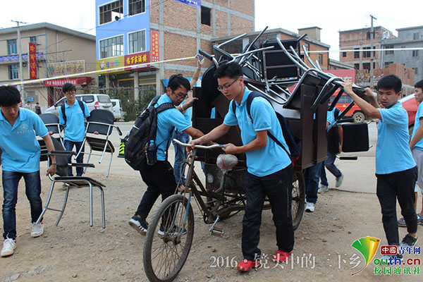 队员搬运桌椅,悉心布置。在三宝街道演出当天队员向当地老乡借了一辆三轮车,用来搬运桌椅。中国青年网通讯员 朱勋迪 供图