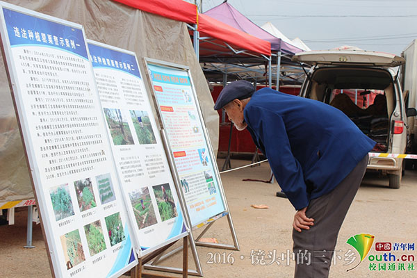 老爷爷观看,实践队员摆放的禁毒防艾展板。虽然已白发苍苍,但老爷爷对于我们的安全知识宣传很感兴趣,认真去读每一个字,也许是在他们年轻时,因为没有系统的安全知识普及宣传,以至于对这迟来的安全知识宣传,情有独钟。中国青年网通讯员朱勋迪 供图