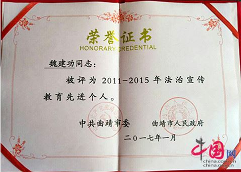 中国网中国视窗讯 近日,中共曲靖市委办公室、曲靖市人民政府办公室联合发文表彰全市 “六五”普法工作先进单位和先进个人,曲靖师院获评“曲靖市‘六五’普法工作先进集体”称号,魏建功老师被评为“法治宣传教育先进个人”。
