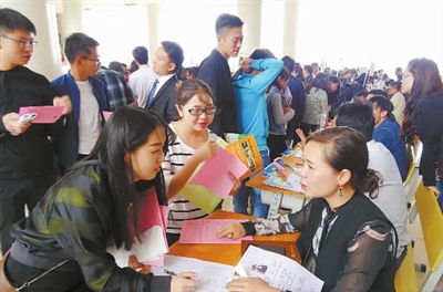 150余家企业前来招贤纳士,为毕业生提供了1500余个岗位,涵盖教育培训、汽车、房地产、IT网络、广告、金融、旅游服务、零售、机械制造等多个行业。众多的工作机会,吸引了超过3000人次的求职者进场求职,当天现场签订意向性就业协议800余人次。图为云南海外国际旅行社有限公司招聘负责人胡安妮(右一)在介绍公司拟招岗位、人数、薪资待遇及职位要求等情况。