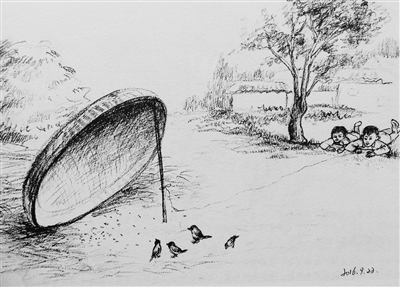 在速写集《故土拾趣》中,震撼我的是露天看电影的享受不亚于今天的3D影院,“磨跷”飞翔的刺激不亚于今天的摩天轮,“冲壳子”侃侃而谈的热情不亚于今天的微信群,“除夕”夜等待礼物的企盼不亚于今天的圣诞平安夜。当年艰辛生活的人们幸福的“心态”都清晰地定格于《故土拾趣》中,给当今的我们以“精神家园”的向往。尽管社会在变迁,时代在前进,这一切的一切已被抛到了历史的记忆中,然而,不忘初心的“故土情结”使画家拿起了手中的画笔。