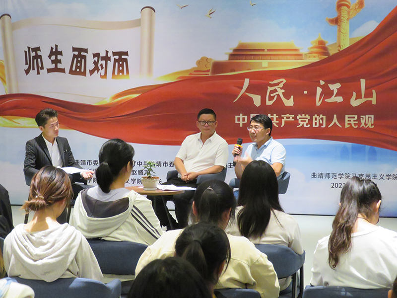 6月30日晚,在庆祝中国共产党成立100周年之际,“人民•江山——中国共产党的人民观”师生面对面主题活动在学校新华书香坊举行,中共曲靖市委党史研究室《中共曲靖市委执政纪要》编辑部主任、曲靖市社科讲师团成员赵腾龙、马克思主义学院副院长杨天虎博士应邀面对面、一对一与学生交流。