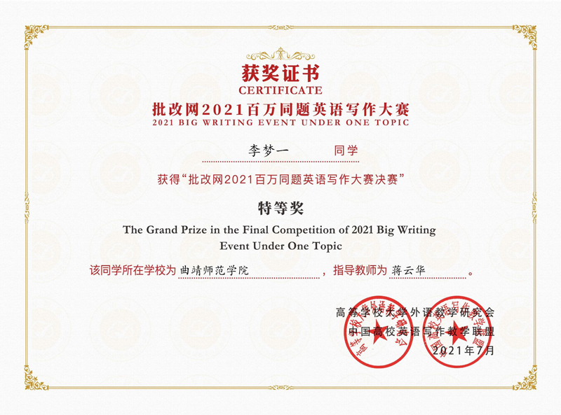 经济与管理学院学生李梦一获“批改网2021百万同题英语写作大赛”特等奖