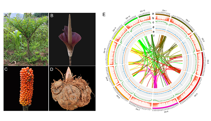 图1 花魔芋的形态及基因组染色体圈图
