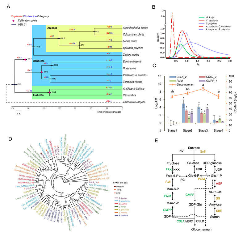 图2 魔芋的基因组进化分析及葡甘聚糖合成基因挖掘
