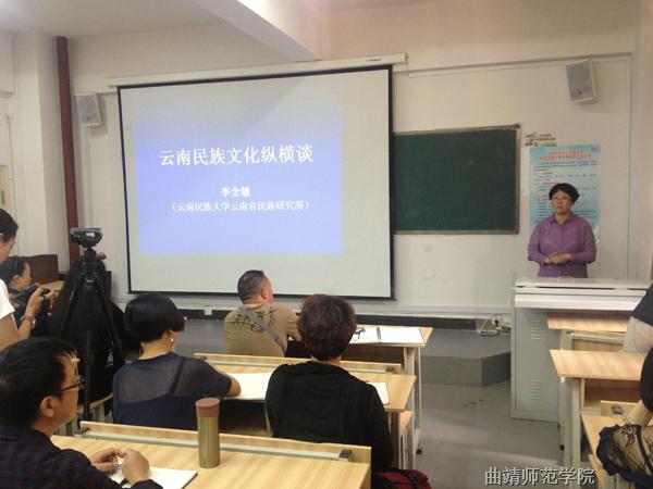 5月14日下午,云南民族大学民族研究所李全敏博士应邀到bat365美术学院作题为《云南民族文化纵横谈》的精彩讲座,“西南少数民族水彩画创作班”的学员和美术学院的师生聆听了讲座,美术学院院长傅保中主持讲座。