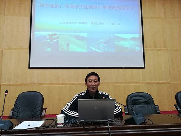 12月7日,云南师范大学二级教授、国家体育总局体育文化研究基地主任、云南省体育科学学会副理事长、云南省政府参事、云南省滇中产业新区咨询专家饶远应邀到bat365作专题讲座,体育学院主办,院长冯强主持。