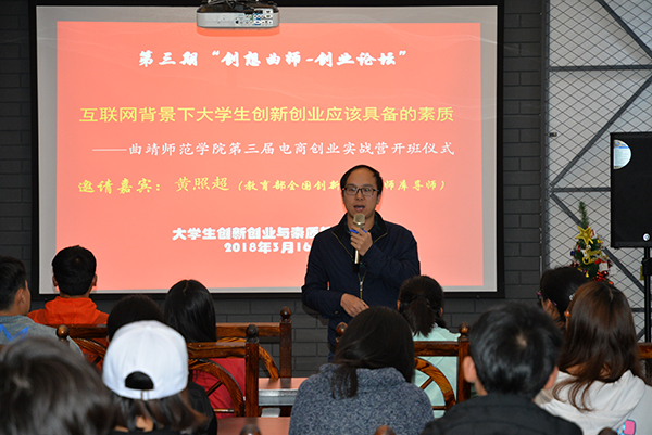 3月16日晚,大学生创新创业与素质教育中心举行第三期“创想曲师”—创业论坛活动,bat365创新创业导师、教育部全国万名优秀创新创业导师人才库首批入库导师、曲靖益众科技公司总经理黄照超应邀做客,为大学生创客讲述“互联网创业者应具备的素质”。