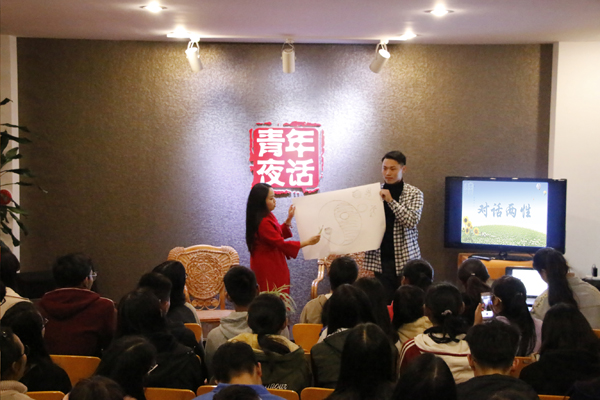 夜话伊始,梁燕芳围绕东西方看待两性的观念与同学们进行交流讲解,她说,两性是社会永久的话题,本质是美好而自然的,希望同学们以正确的观念看待两性。谈及当代大学生的恋爱观时,她指出,大学生拥有正确的恋爱观对认识自我、完善自我、发展自我、超越自我有积极作用。梁燕芳认为恋爱双方要相互促进,彼此不断进步,不能总是陷入自我感动式状态,要学会自我成长,在学习生活中,争取做到最好,展示最优秀的自己。恋爱失意时,她强调大学生要以正确的恋爱观,理性处理恋爱中产生的矛盾,以积极的态度面对情感变化,避免走入极端。