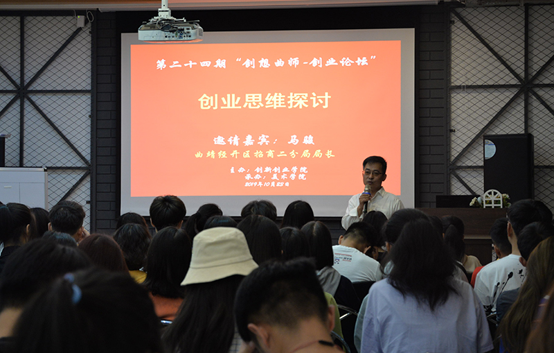10月23日,创新创业学院主办、美术学院承办的第二十四期“创想曲师”创业论坛开讲,曲靖经开区招商二局局长,创行中国特邀评委,车库咖啡项目评审委委员马骏做客现场,展开"创业思维探讨"。