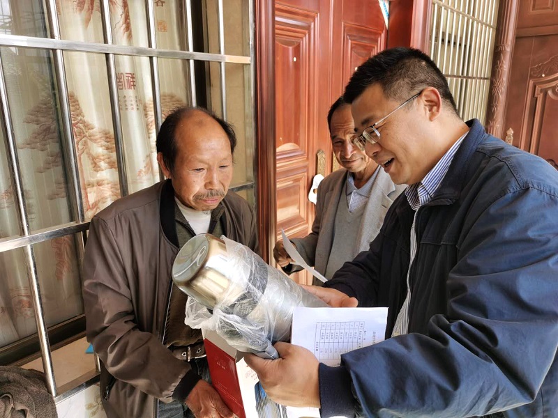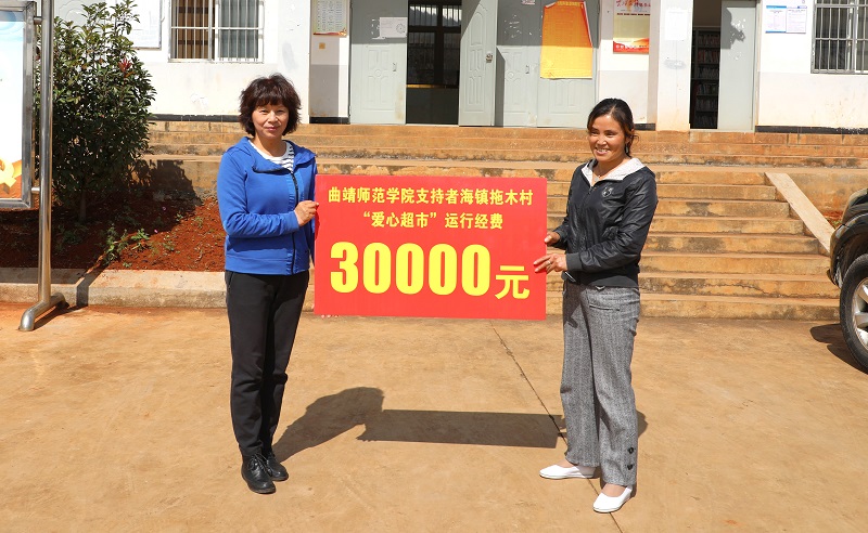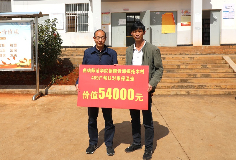 李永勤一行来到者海镇拖木村,举行了精准帮扶捐赠仪式。徐显敏代表学校向帮扶对象捐赠了价值5.4万元的保温壶,李莉代表学校向拖木村捐赠了3万元的“爱心超市”运行经费。