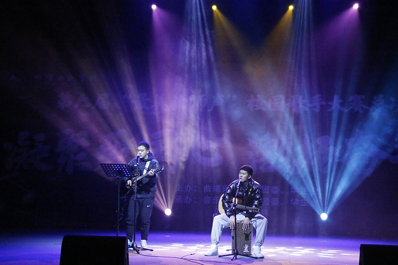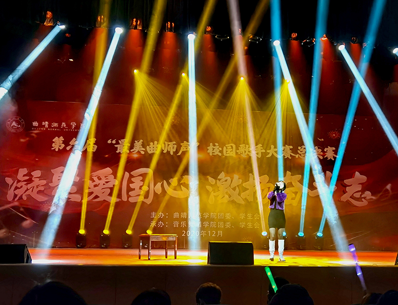 本次大赛分唱响青春和歌唱祖国二个环节。在唱响青春环节中,专业组杨梅等同学一首首悦耳的歌曲展示了专业选手的不凡实力;非专业组李正熙等同学以其深厚的歌唱功底,点燃了在场观众的热情。在歌唱祖国环节,专业组选手一曲慷慨激昂的《我爱你中国》将现场气氛推向高潮;当非专业选手在台上唱响《我和我的祖国》时,台下的同学齐齐挥动手中的国旗,共同唱响爱国的主旋律,祝福祖国繁荣昌盛,展现曲师青年拳拳中国心、炽热中国情。