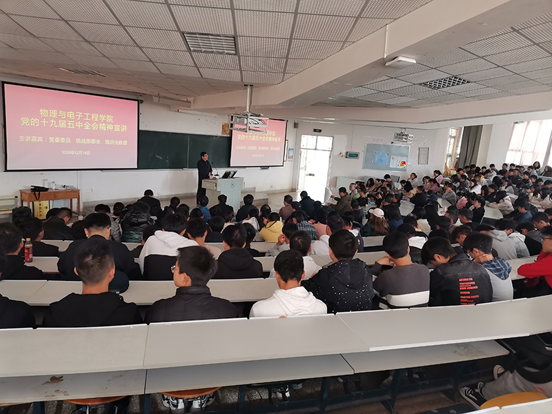 学校党委委员、教师宣讲团成员钱润光教授分别到物理与电子工程学院、文化旅游学院,作了题为《开启新征程,描绘新蓝图》的宣讲,他通过对历史与现实、当前与未来、国内与国际形势的深入分析,定量与定性结合,总结了十九届五中全会的“五个新”即:总结新成就、作出新判断、描绘新蓝图、确定新目标、提出新要求。他希望同学们以青春之躯,以拼搏奋斗精神向2035年进发,追逐和实现自己的梦想。