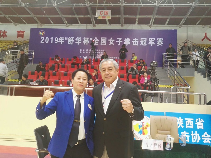 2019年,薛凤飞(左)在全国女子拳击冠军赛中担任裁判,与国际拳联裁委会副主席雷·席尔瓦先生合影。
