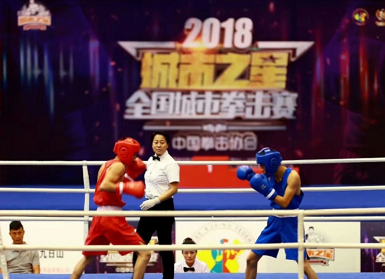 薛凤飞在2018年全国城市拳击赛中担任裁判。