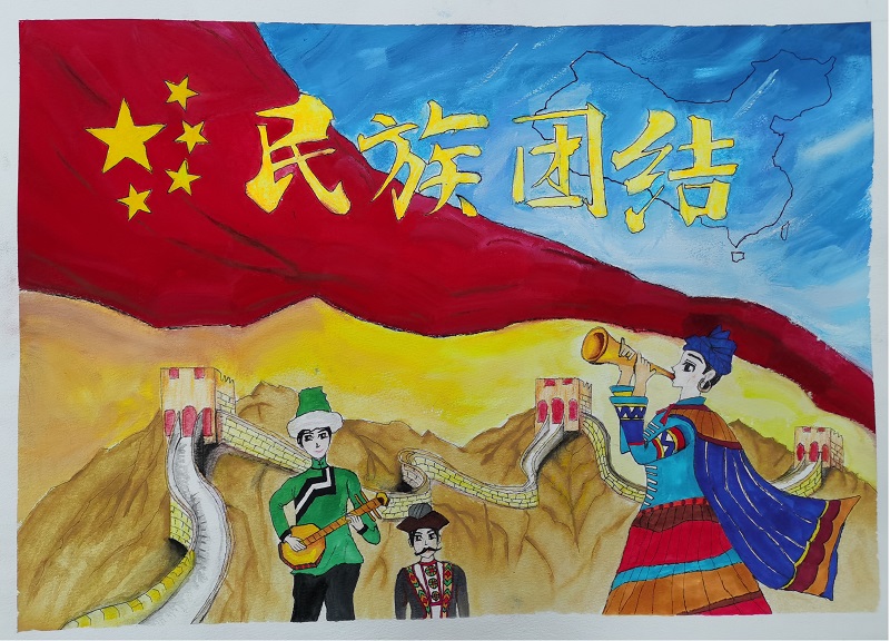 水粉画《民族团结共促繁荣》文化旅游学院学生郑艺作