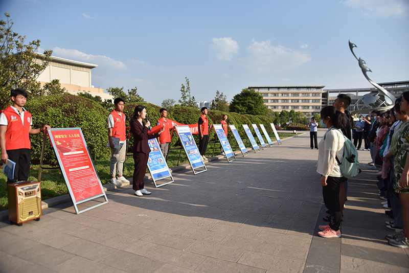 讲座结束后,同学们在公安局工作人员带领下来到图书馆门口,观看了防邪教宣传展板,并进行反邪教宣誓。