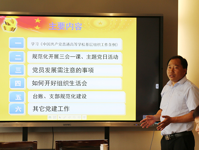 常艳兵围绕《中国共产党普通高等学校基层组织工作条例》《中国共产党支部工作条例(试行)》《中国共产党发展党员工作细则》《高校教职工党支部规范化建设标准》《学校党费收缴、使用和管理办法》及党史学习教育相关内容,结合工作实际,重点讲述了规范化开展三会一课、主题党日活动、党员发展需注意的事项、如何开好组织生活会、台账和支部规范化建设等内容。他还就党建工作制度建设、队伍建设、经费保障、品牌建设等方面,与参训人员分享了提升党建工作质量和影响力的做法和经验。