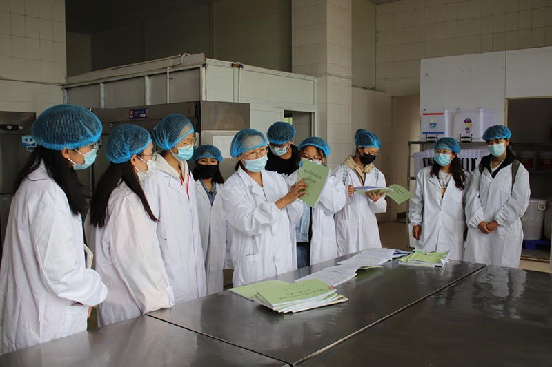 活动中,学生分为三组分别走进食堂后厨蔬菜清洗间、蔬菜切配间、食材存储间、消毒间、烹饪间等操作间进行参观体验。食堂工作人员按照“六T”实务管理的要求从食品原料采购验收、清洗、储存、加工、留样等各个环节以及各个操作区域的规范操作要求进行了细致的讲解并耐心细致解答同学们提出的问题。