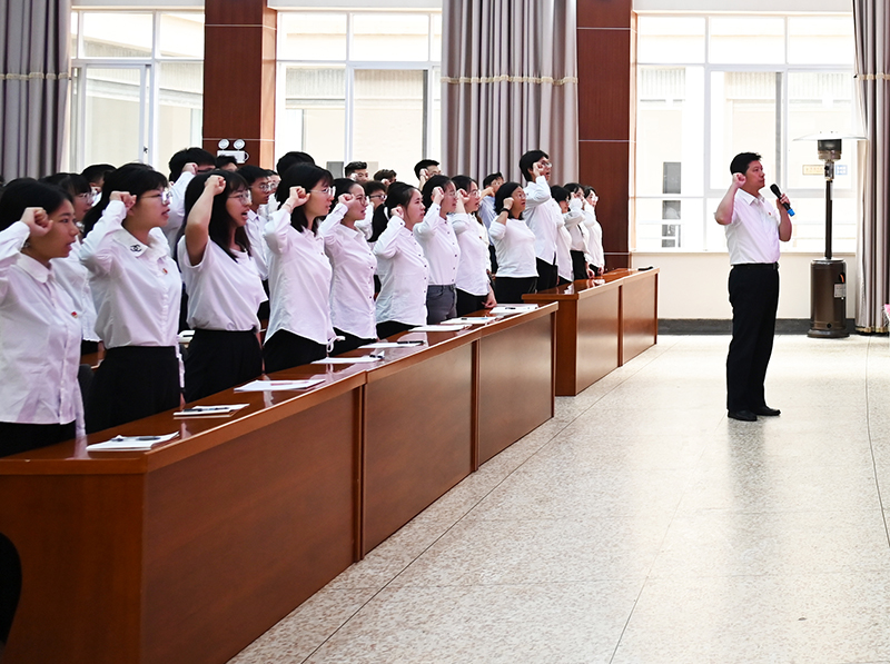“我志愿加入中国共产党,拥护党的纲领,遵守党的章程,履行党员义务,执行党的决定,严守党的纪律,保守党的秘密,对党忠诚,积极工作,为共产主义奋斗终身,随时准备为党和人民牺牲一切,永不叛党。”在李永勤带领下,100名新党员代表整齐列队,佩戴党徽,举起右拳,庄严宣誓。铮铮誓言响彻曲师校园,字字铿锵表达了每一名党员对党的忠心和为共产主义事业奋斗终生的决心。