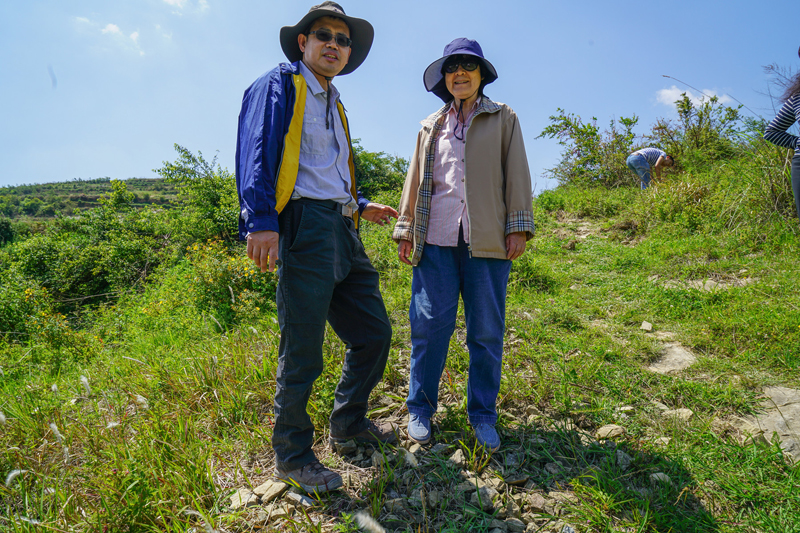 2018年5月16日,张弥曼与朱敏(左)在曲靖麒麟区实地考察潇湘动物群化石发掘地的保护情况。