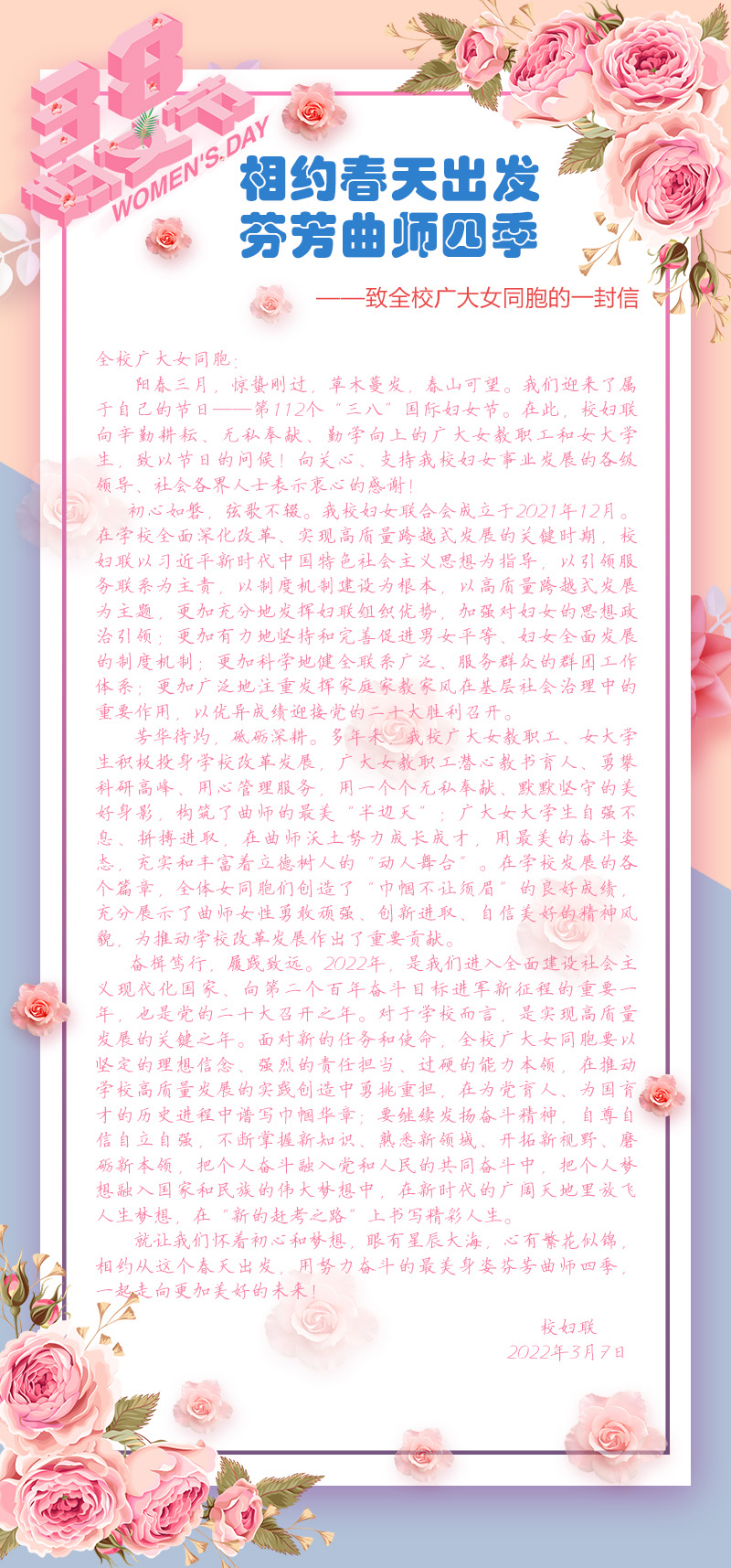 相约春天出发 芬芳曲师四季——致全校广大女同胞的一封信