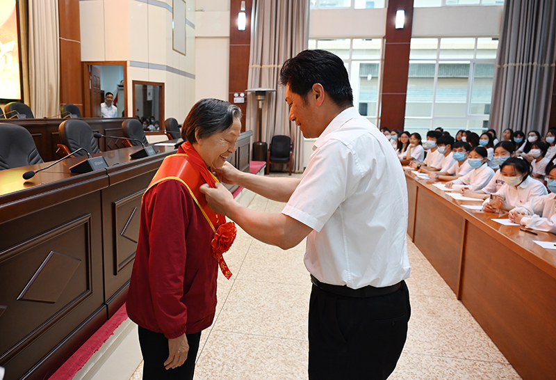 上午,“奋进新时代 宣誓铭初心 献礼二十大”活动暨“光荣在党50年”纪念章颁发仪式在图书馆三楼报告厅举行。李永勤为离退休老党员代表高金莲同志颁发“光荣在党50年”纪念章。陆选荣主持活动。在党委组织部部长臧国书领誓下,180余名新党员代表共同面向党旗宣誓。