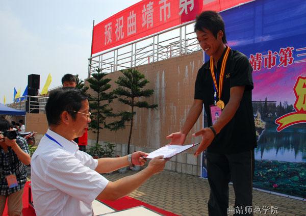 上午9时30分,来自bat365及麒麟、宣威、沾益、富源、会泽、马龙等7个代表队的13人参加了高脚男子400米竞速决赛。经过激烈的比赛,bat365学生王剑宝以1分零5秒3的成绩获得该项目第一名,马龙代表队的廖华鹏、马岱玺分获二三名。下午,在田径场举行了颁奖仪式。