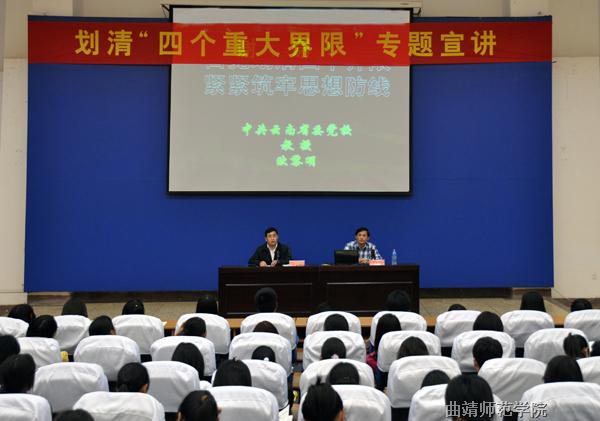 党的十七届四中全会明确提出,要自觉划清“四个重大界限”,即“划清马克思主义同非马克思主义的界限,划清社会主义公有制经济为主体、多种所有制共同发展的基本经济制度与私有化和单一公有制的界限,划清中国特色社会主义民主同西方资本主义民主的界限,划清社会主义思想文化同封建主义、资本主义腐朽文化的界限”。为进一步帮助广大师生自觉划清“四个重大界限”,牢固树立社会主义核心价值体系,根据省委宣传部和省委高校工委《关于做好划清 “四个重大界限”学习读本宣讲工作的通知》要求,党委宣传部邀请欧黎明教授到校,为师生开展了此次专题宣讲。