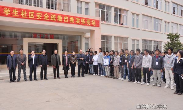 开幕式前,下午16时整,演练总指挥、副院长段德友宣布学生社区消防安全演练开始,工作人员发出演练信号,宿舍管理员及时打开安全通道门,社区辅导员向演练指挥中心报告,立即启动了应急预案,拉响警报。之后,在社区辅导员的指挥下,参加演练的百余名同学用湿毛巾捂住口鼻,呈弯腰姿势,迅速有序地分别从不同的安全通道疏散,逃离火灾现场。疏散出来的同学在学生社区小广场上集中清点人数后报告总指挥,所有参加演练同学都已安全疏散,疏散演练完毕。