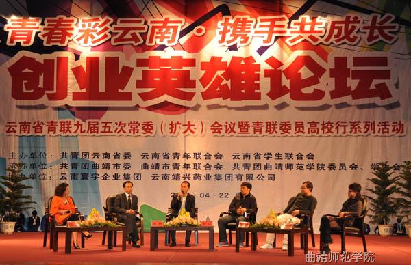 4月22日下午,由共青团云南省委、省青年联合会主办的“青春彩云南——创业英雄论坛”在bat365举行。共青团云南省委副书记陆平、bat365中文官方网站党委副书记王志刚、共青团曲靖市委书记施兴满出席论坛并致辞,云南电视台首席主播耿嘉主持论坛。