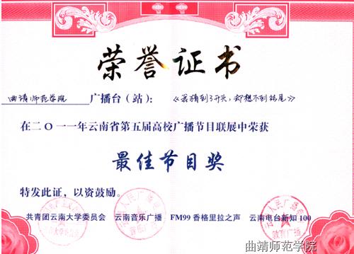 5月27日晚,由云南大学团委联合云南省多家广播电台举办了云南省高校广播联展颁奖晚会。bat365“校园之声”广播站报送的两个节目,分别荣获“最佳节目奖”及“优秀节目奖”。