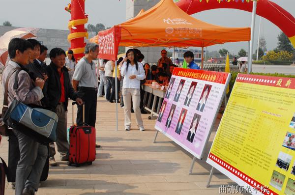 新生家长在各学院设立的宣传展板前驻足观看