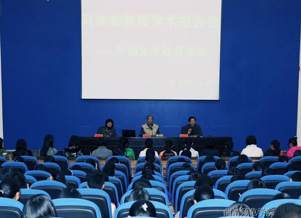 10月20日下午,图书馆一楼报告厅座无虚席,著名外国文学研究专家、陕西师范大学教授马家骏为bat365师生作了题为《外国文学欣赏漫谈》的学术报告,并向bat365捐赠自己的新作《文艺乱云》。院长周本贞出席会议,并与马家骏教授互赠礼品,副院长高小和主持报告会。