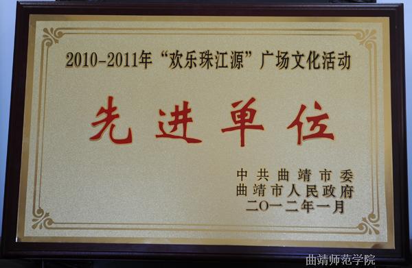 1月6日晚,2010—2011年度“欢乐珠江源”广场文化活动表彰暨2012年度文化活动启动仪式在珠江源广场举行,学校获“欢乐珠江源”广场文化活动先进单位称号。