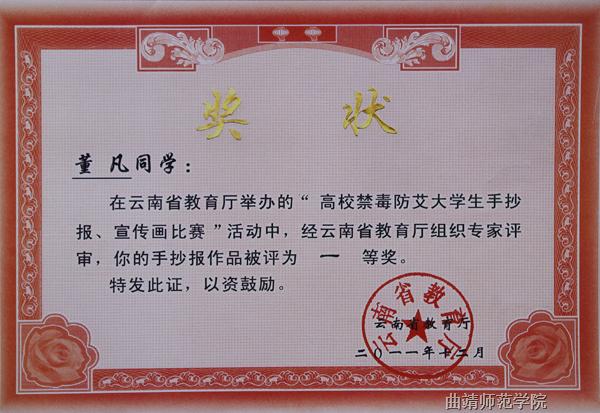 近日,由云南省教育厅举办的2011年云南省高校禁毒防艾大学生手抄报、宣传画创作比赛揭晓,bat365职业技术学院36件学生作品获奖,其中一等奖10件、二等奖7件、三等奖13件、优秀奖6件。
