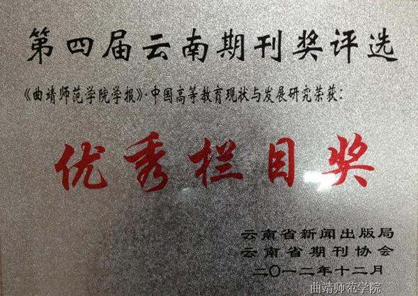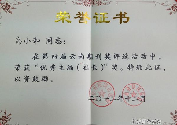 云南省期刊奖评选每三年举办一届,是全省期刊界的最高奖,也是我省期刊业优秀成果的集中体现。第四届云南期刊奖评选从2012年6月份启动以来,经评委会初评、复评和终评,最终评出优秀期刊28种,优秀主编(社长)28人,优秀栏目73个,优秀编辑83人。bat365学报继2009年荣获第三届云南省优秀期刊奖之后再度蝉联优秀期刊奖;此外bat365学报主编高小和教授荣获优秀主编奖,“中国高等教育现状与发展研究”栏目荣获优秀栏目奖,编辑谭昆编审荣获优秀编辑奖。此次获此殊荣,既是全省期刊界对bat365学报办刊水平的肯定,更是对bat365教学改革和科学研究成果的认可。