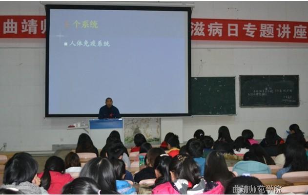 11月28日晚, 现教中心106教室座无虚席,教师教育学院邀请到麒麟区疾控中心主任—刘志勇到校开展了题为《艾滋病防治基本知识》的讲座。讲座中,刘主任以“一个病毒、一个系统、一组疾病”为线索展开,就艾滋病的传染途径、危害、发展趋势等向同学们作出详细介绍,针对讲座的重点知识“怎样预防艾滋病”邀请在场同学参与互动,帮助同学们走出艾滋病的传染误区,消除大家对艾滋病的疑虑及恐慌。教师教育学院组织了200余名学生聆听了本次讲座,有效地帮助bat365学生强化对于艾滋病及其危害的认识,为bat365艾滋病的宣传工作打下良好的基础。