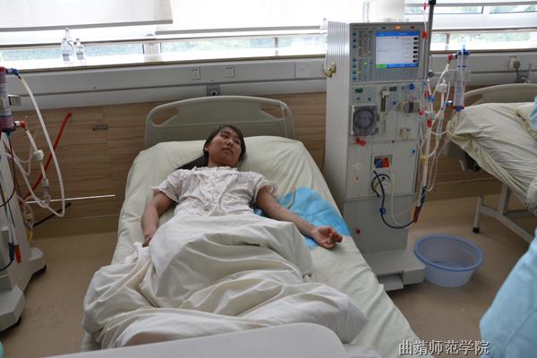 三点钟,徐瑞进入病房开始透析,我们跟随她进入病房。当针管插入徐瑞的胳膊时,我们禁不住屏住呼吸,转过头去。看着鲜红的血液慢慢涌入机器,当机器的轰鸣响起,我们都在默默为徐瑞祈祷:让这位可敬的老师早日康复吧!