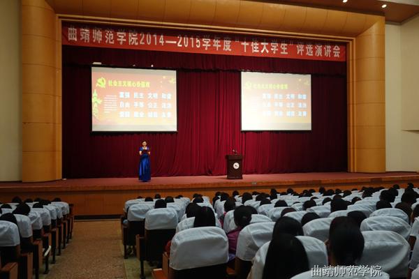 为积极培育和践行社会主义核心价值观,深入宣传表彰大学生先进典型,集中展现当代大学生的精神风貌,充分发挥先进典型的示范引领作用,积极引导大学生学习先进、争当先进,在全校营造促进大学生健康成长的良好环境,由党委学生工作部组织,在全校范围内开展了2014-2015学年度“十佳大学生”评选活动,27名同学经过各学院初审后上报参评材料。党委学生工作部组织专人对上报学生材料进行认真审查,要求参选人在热爱祖国、敬业奉献、勤奋学习、科技创新、志愿服务、热心助人、见义勇为、诚实守信、孝老爱亲、艰苦奋斗、自强不息等方面表现突出,在学生中有较强的示范、引领作用。在进行严格审定后,李春晓等15名同学最终胜出,进入此次演讲比赛阶段。演讲比赛设教师、学生评委各七名,分别由学校相关部门的领导和优秀学生代表担任。