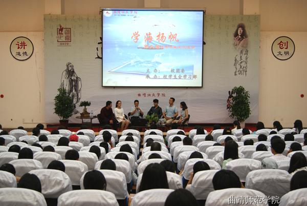 6月17日晚,校团委、学生会举办第九届“学海扬帆”优秀毕业生交流会。2015届优秀毕业生柏曦、高爽、闫波、朱加宽4位同学应邀与300余名同学分享参加考研、考公务员、创业求职的奋斗历程和成功经验。