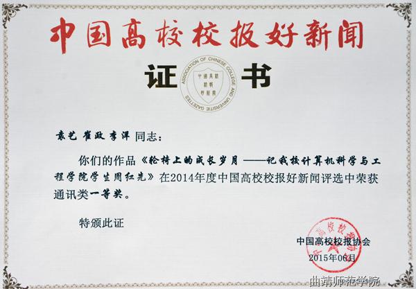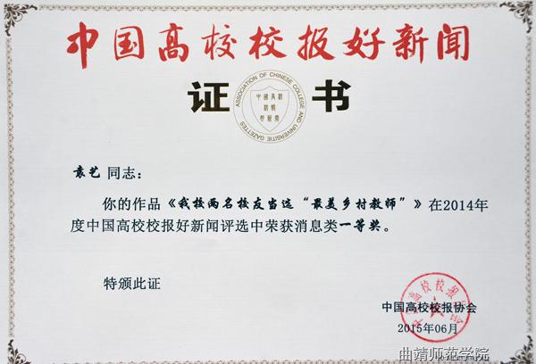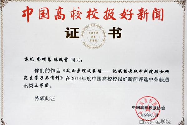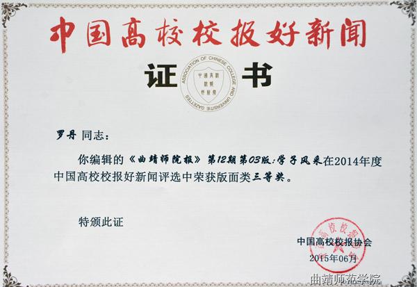 今年3月,中国高校校报协会开始“中国高校校报好新闻”的报送和评选工作,对2014年度中国高校校报的新闻作品进行评选,有来自28个省市自治区的645所高校报送了3032篇作品参评。经评委会专家严格评审,bat365报送的5件作品获好新闻奖,其中袁燚、崔政、李洋撰写的《轮椅上的成长岁月》获通讯类一等奖;袁燚撰写的《bat365两名校友当选“最美乡村教师”》获消息类一等奖;罗丹撰写的《bat365稳步推进国际化办学进程》获消息类三等奖;罗丹编辑的《曲靖师院报》第12期学子风采获版面类三等奖;袁燚、尚明慧、陈风雷撰写的《风雨兼程成长路》获通讯类三等奖。