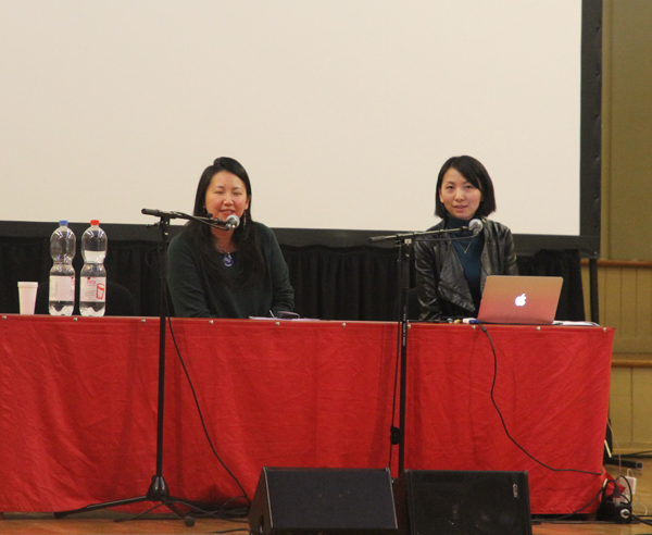 董捷(右)在本场会议主席、来自英国的谭诗怡帮助下回答学者提问