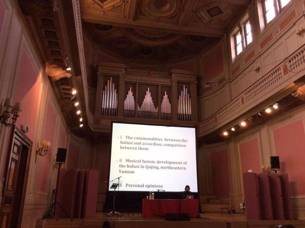 董捷作为本次会议邀请的主旨发言人之一,在会上作了题为《手风琴与葫芦丝的音乐碰撞》的学术报告。她从葫芦丝与手风琴的共通点对比性与融合性、云南曲靖葫芦丝的发展现状、乐器发展与音乐创作等三个方面,深刻解读了云南本土民族乐器葫芦丝与西洋乐器手风琴之间的音乐融合,受到了世界各国学者、音乐家的广泛好评。
